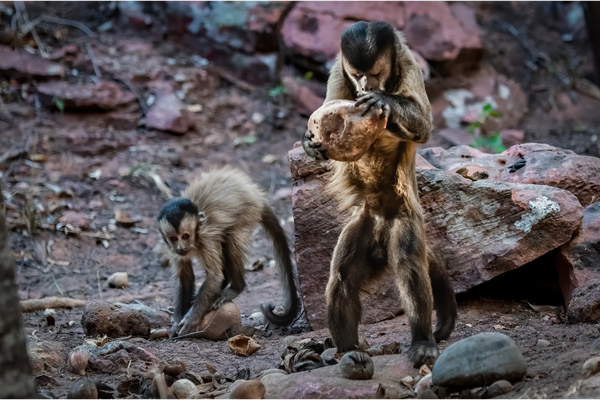 Today, embark on a brief drive to a different location, offering a close-up encounter with the renowned "Einstein Monkeys" or "Nutcracking Monkeys." The Bearded capuchin monkeys, the first non-ape primates discovered using tools in the wild, exhibit remarkable intelligence. They skillfully crack tough nuts by placing them on pitted stone anvils and striking them vigorously with other large rocks. Scientific studies have unveiled their ability not only to use tools but also to employ them with skills akin to humans.