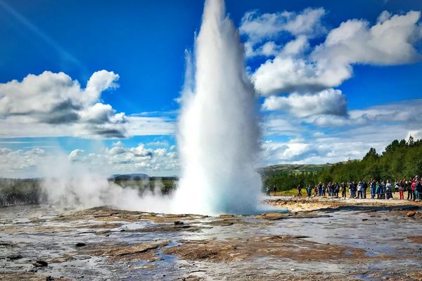We start early, journeying along Iceland’s renowned Golden Circle. At Þingvellir National Park, walk through the dramatic rift valley between the Eurasian and North American tectonic plates while learning about the site’s role in Icelandic history. This UNESCO site is a geological wonder and the heart of Iceland’s political heritage. At Geysir, the earth comes to life as Strokkur shoots boiling water into the sky every few minutes. We continue to Gullfoss, where glacial waters thunder into the canyon below, often accompanied by shimmering rainbows in the mist. After a hearty lunch nearby, we'll explore Brúarhlöð, a hidden gem shaped by ancient glacial floods. The day’s adventures don’t end there—soak in the secluded Hrunalaug hot springs before visiting the colorful Kerið Crater. We’ll spend the night in Selfoss, with the option for a lava cave tour or an evening of birdwatching at Flóahreppur.