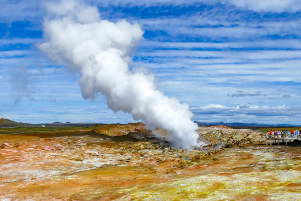 Begin the morning with an invigorating hike to Hengifoss, where layers of red clay and black basalt create a stunning backdrop to Iceland’s third-highest waterfall. After breakfast, we relax at Vök Baths, where geothermal waters float on the surface of Lake Urriðavatn. Our adventure continues at Dettifoss, Europe’s most powerful waterfall, where the thundering waters send tremors through the ground. On the way, keep your eyes peeled for reindeer roaming the wilds. From here, we explore the geothermal wonders of Krafla, where steaming vents and colorful mud pools dominate the landscape. After lunch near Lake Mývatn, we explore the eerie lava formations at Dimmuborgir and the hot spring cave of Grjótagjá, where we can take a dip inside the cave's geothermal pools, before making our way to Húsavík for a restful evening.